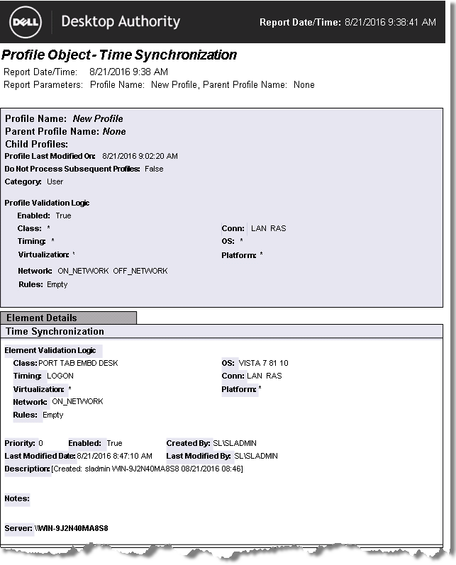 The Profile Object - Time Synchronization report details all Time Synchronization elements for the specified profiles. The report includes a Profile Summary of each profile containing Time Synchronization elements followed by each element's details including Validation Logic, Created By, Last Modified Date and Last Modified By.