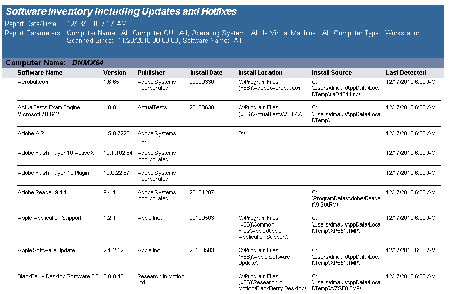 The Software Inventory including Hotfixes and Updates) report reports on data collected from computers logging onto the network. The report details each computer's installed software.