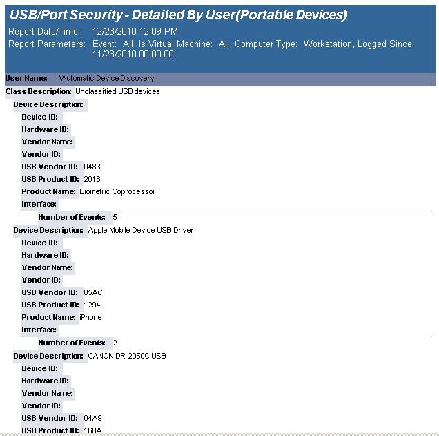 The USB-Port Security - Detailed by User (Portable Devices) report reports on data collected about all Portable device classes, USB and Firewire.