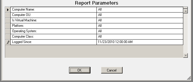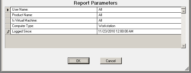 The USB-Port Security - Detailed by User(Fixed Devices) report prompts the user for the Scanned Since date to report on. The report can also be run for All machines, Virtual Machines only or Non-virtual Machines only.