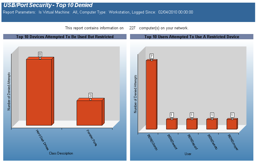 The USB-Port Security - All USB Devices by Computer report reports on data collected about all USB devices used on the network and are within the report parameters.