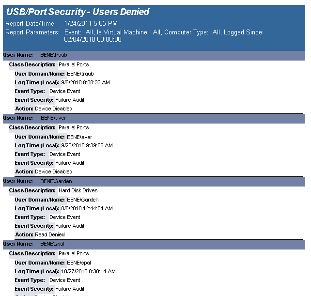 The USB-Port Security - All USB Devices by User report reports on data collected about all USB devices used on the network and are within the report parameters.