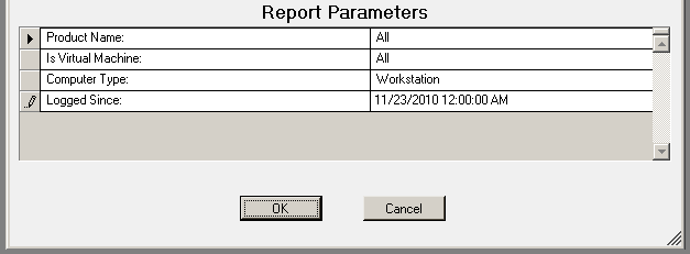 The Software Inventory report prompts the user for the Scanned Since, Computer Name and Virtual Machine type.