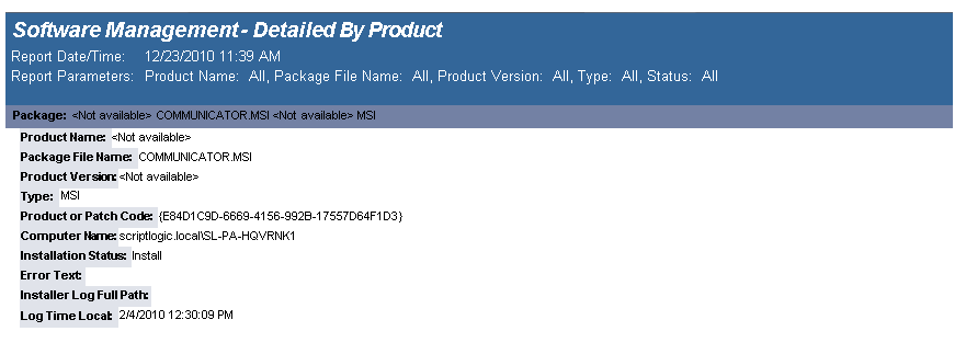 The Software Management - Detailed By Product report details the packages that have been deployed by a Software Management configuration element.