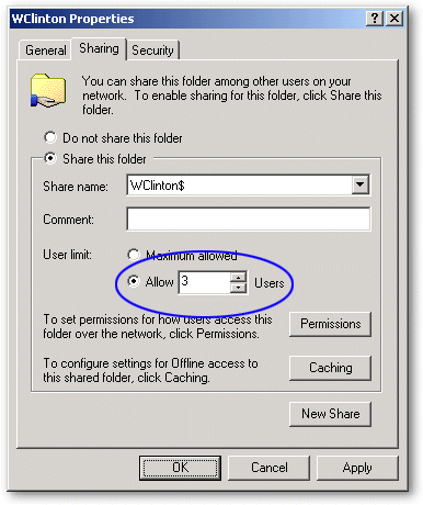 Since the Concurrent User Limit is applied individually to each user's share, you can configure your users to have different concurrent logon maximums while other users (such as Administrators) have no limit. This is done by setting the maximum number of connections in the properties dialog box for the share of the individual’s user folder.