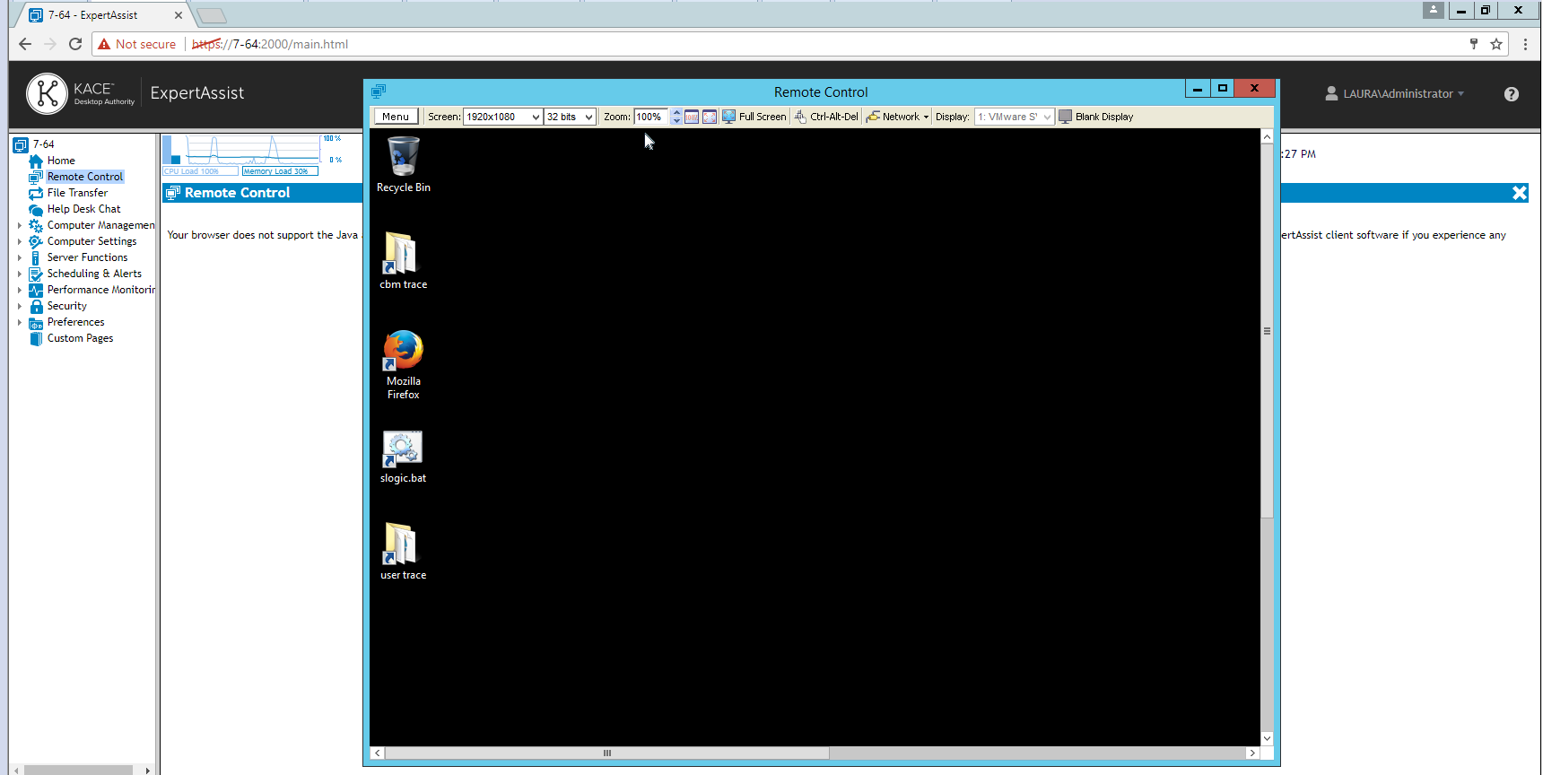 When you select Remote Control, a small Java applet is downloaded to the client and will display the screen of the remote computer. Your actions, such as keyboard usage and mouse movement are emulated by ExpertAssist on the screen and on the remote computer. The Java applet downloads automatically.