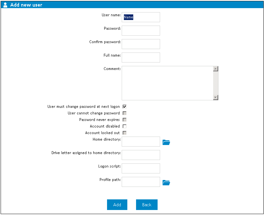 The Manage User dialog presents the same configuration settings as the Add User dialog. The Manage User dialog also presents several different user account statuses—Last logon, Last logoff, Account expires, Password last changed, Bad password count and Number of successful logons.