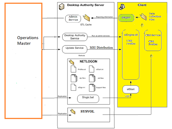 Desktop Authority Client Agent begins with the Windows login process. Users having the slogic.bat script run the script from their authenticating domain controller’s NETLOGON share at login. This begins the sequence that prepares the machine for engine operation, prepares the engine and then finally runs the engine, applying the configuration to the machine.