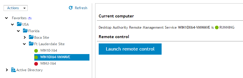 The favorites list displays computers that have been added to the favorites list from the Active Directory tree. The computers in the Favorites list lets you organize and quickly access the most frequently used computers. "Favorite" computers can be organized into folders by adding, moving, or deleting them.