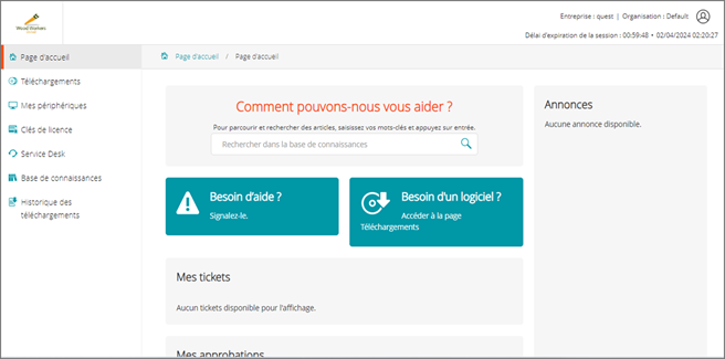 Vous pouvez afficher ou masquer les boutons d’action et les widgets qui s’affichent sur la page d’accueil de la Console utilisateur. Les boutons d’action permettent aux utilisateurs d’accéder rapidement aux pages sur lesquelles ils peuvent créer des tickets du Service Desk et télécharger des logiciels via la Console utilisateur. Les widgets permettent d’ajouter des liens et annonces personnalisés à la page d’accueil de la Console utilisateur.