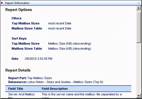 Report Details include a list of the report parts (tables and graphs) that comprise the report. This section also shows a list of the data sources and all the fields (and the field descriptions) that are used. |