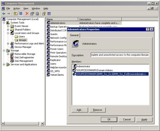 To add the Source Exchange Account to the local Administrators group on each source Exchange server involved in the migration, perform the following: