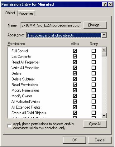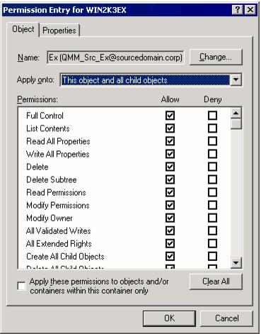 To work with the source Active Directory objects, the Source Exchange Account needs the Full Control permission on the organizational units and their child objects that contain the objects to be synchronized. This permission should be set on the domain controller where the objects you need to synchronize are located.