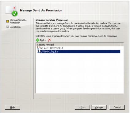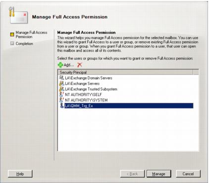 To make sure the above actions were performed correctly, please view the Manage Full Access and Manage Send As dialogs in Exchange Management console. You should see the Source Exchange Account in both of the dialogs below.