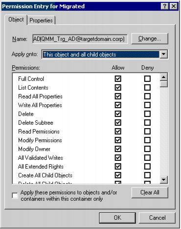 To work with the target Active Directory objects, the Target Active Directory Account needs the Full Control permission on the organizational units and their child objects that contain the objects to be synchronized. This permission should be set on the domain controller where the objects you need to synchronize are located.