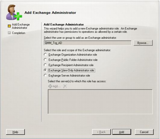 Caution: If the Target Active Directory Account is located in another trusted forest, you cannot assign the Exchange View-Only Administrator role to this account. In this case grant the Read permission for the Microsoft Exchange container and its child objects to the account in the Configuration partition using the ADSIEdit snap-in. |
