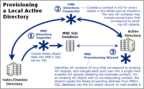 In many organizations the migrating users are already using AD security objects for network authentication prior to the migration project.Where Notes users already exist as user objects in Active Directory, the CMN Directory Connector (and other directory-update tools) will produce duplicate entities in AD. But MNE includes a Provisioning Wizard that can merge the contact information into the original AD object record and delete the contact, leaving a single mail-enabled object in Active Directory.