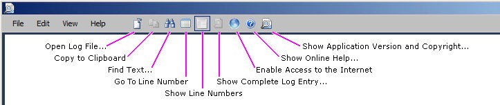 Most Log Viewer features are accessible by the program’s menus and/or the program tool bar, which share a horizontal band across the top of the screen:
