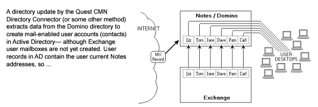 You also install the Quest Coexistence Manager for Notes (CMN), and run its Directory Connector to perform a directory update between the source and target servers. This process creates mail-enabled accounts (contacts) in Active Directory for all Notes users. The CMN Directory Connector does not create mailboxes, but its directory update provisions new mail-enabled contacts in Active Directory, which associates the existing user Notes addresses with their corresponding new objects in AD. The new objects are said to be “mail-enabled” because Exchange can now accept mail addressed to these user Notes addresses and route it to the corresponding mailboxes on the Domino server.
