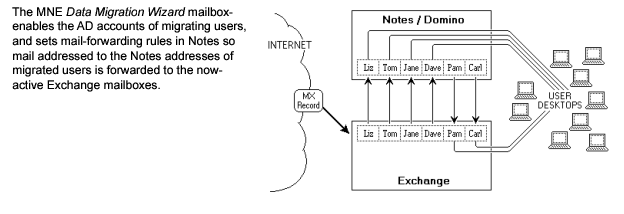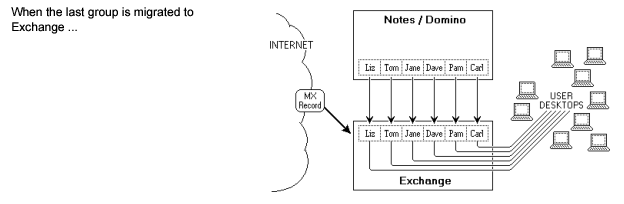 Users in this scenario are migrated in a series of collections (user groups) over a period of weeks, so you will require an email coexistence strategy that permits mail-forwarding throughout the transition period—when some users have already been migrated to Exchange while others wait their turn back in Domino. If you choose the SMTP method of mail-routing and want a single-domain approach, you would configure a smart host for each environment. (All of the coexistence methods and their alternatives are summarized in the Migrator for Notes to Exchange Pre-Migration Planning Guide.) When the SMTP mail-routing is configured, you modify the MX (Mail eXchange) record to direct external (Internet) mail to the Exchange environment. Since no users are yet migrated but all users are provisioned and mail-enabled in Active Directory, for now all inbound Internet mail is routed back to the corresponding Notes mailboxes.