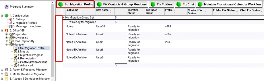 Expand the Migration | 1. Set Migration Profile views, select users and click the Set Migration Profile button: