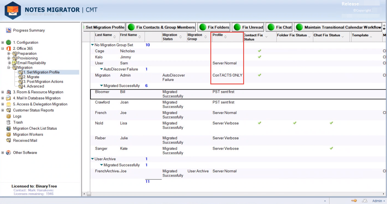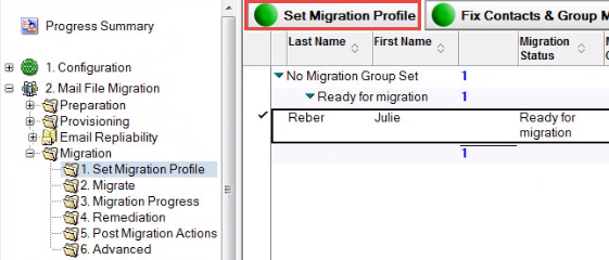1. Expand the Migration | 1. Set Migration Profile views, select users and click the Set Migration Profile button: