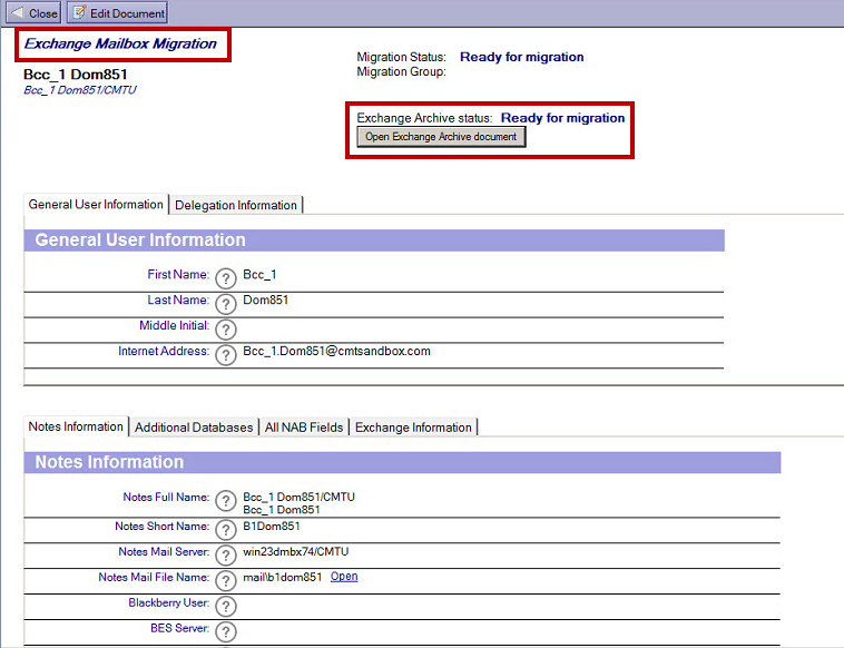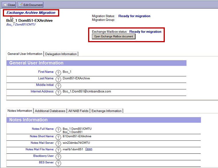 The Exchange Mailbox document and Exchange Archive document are linked in the Notes Migrator.nsf (EMM) database but are migrated as distinct documents as they do not share migration histories.  The link between the two documents can be further seen when opened.  The Exchange Mailbox document displays the status of Exchange Archive document and a button to open the Exchange Archive document. Likewise, the Exchange Archive document displays the status of the Exchange Mailbox document and a button to open it.