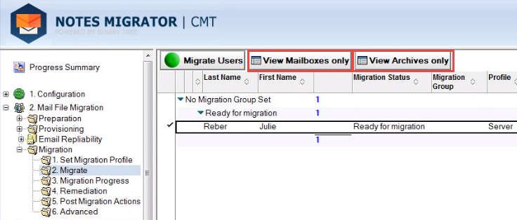 2. During the Migrate step, select one or more Exchange Archive document(s) and click Migrate Users; the Exchange Archive documents are migrated to the Exchange archive; the View Mailboxes only and View Archives only buttons allow you to filter the displayed list