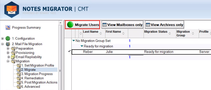 3. Select user(s) that are ready for migration, and then click Migrate Users in the Data Pane: