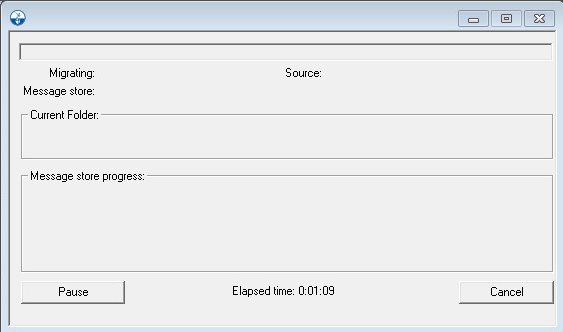1. The CMT progress box displays the files being migrated on the workstation that the migration job was assigned to. This can be checked in the CMTMonitor web browser page on the migration control center. You can pause or cancel the migration by clicking the Pause and Cancel button, respectively. Depending on the amount of data for the user that is being migrated, the processing may take some time: