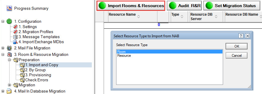 The Rooms and Resources database consists of multiple calendars. You cannot migrate all Rooms and Resources at once because multi-calendar databases are not supported in Microsoft Exchange. For this reason, you need to import each room and resource from this database separately into the server.