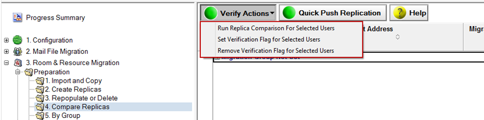 5. Select an option form the Verify Actions drop-down menu; a Quick Push Replication option is also available; click the Help button for more information about the replica comparison view: