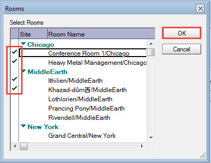 2. A message box appears displaying the rooms you selected in the previous step; click OK to continue: