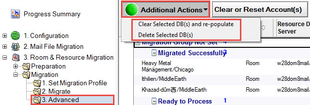 7. Before migrating, clear or delete any necessary databases; in the Advanced view, select the rooms and resources, click Additional Actions and select the appropriate drop-down menu item: