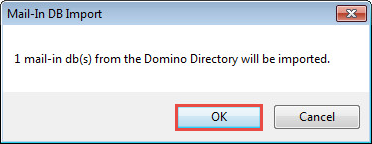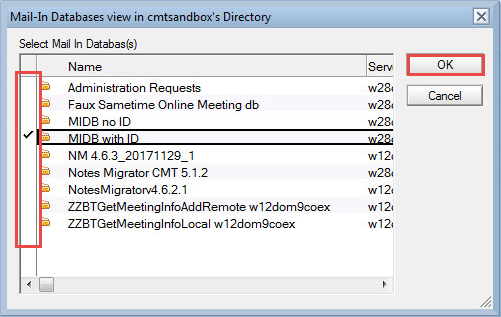 3. From the Mail-In Databases view in <Domino directory> dialog box, select the mail-in database that you want to migrate and click OK: