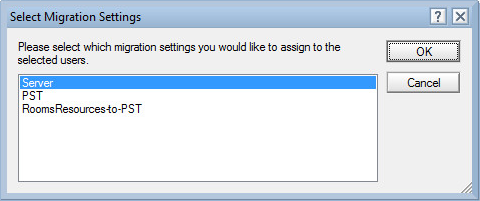 3. Select the migration profile created earlier to migrate rooms and resources to a .pst file, and click OK: