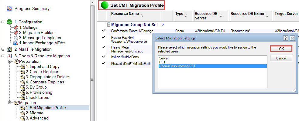 2. Select rooms and resources in the Data Pane and click the Set CMT Migration Profile button