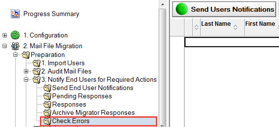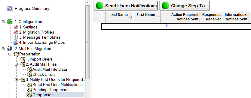 If the user’s mail files do not move out of the Notify view, then you need to move them to the Match view using the Change Step To button. Do this when you have ensured that all the notifications have been sent, all the pending responses have been responded to, and there are no unresolved errors.