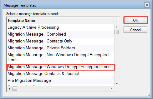 In the Message Templates dialog box, a list of available predefined templates is displayed; if you have created pre-migration custom templates, these will also be listed; select the template you wish to send and click OK; for example, select the Migration Message – Windows Decrypt Encrypted Items message template, and click OK: