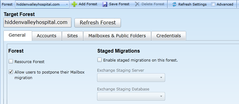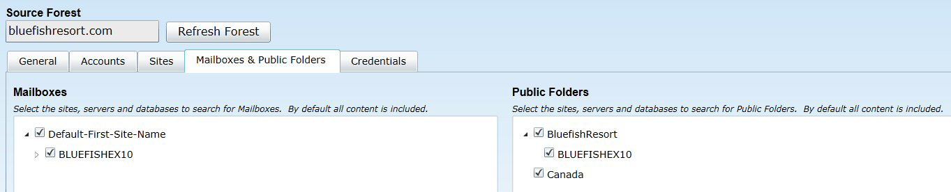 To view or edit the Mailboxes & Public Folders tab for source forest configuration: From the Forest view toolbar, select a previously defined source Forest from the drop-down list, and then click the Mailboxes & Public Folders tab. On this tab, all options are displayed whether or not the Advanced checkbox is marked.