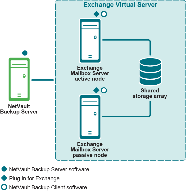 In a CCR deployment, the plug-in is installed on the Exchange Virtual Server. The Exchange Virtual Server is a group of nodes and hosts that make up the cluster. The NetVault Backup Server sees the cluster as a single client, which is called a Virtual Client. When installing the Plug‑in for Exchange on the Virtual Server, the plug-in is installed on all nodes by using NetVault Backup’s Cluster Support. NetVault Backup’s Virtual Client is used to back up either the Active or Passive node, which in this example is the Exchange Virtual Server.
