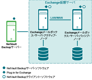 あるSCCシステム構築では、プラグインはExchange仮想サーバーにインストールされています。Exchange仮想サーバーは、クラスタを構成するノードとホストのグループです。NetVault BackupServerはクラスタを仮想クライアントと呼ばれる単一クライアントとみなします。仮想サーバーにPlug‑in for Exchangeをインストールする場合、プラグインはNetVault Backupのクラスタ・サポートを使用してすべてのノードにインストールされます。NetVault Backupの仮想クライアントは、単一のクラスタ化リソースのバックアップに使用され、この例ではExchange Virtual Serverに相当します。