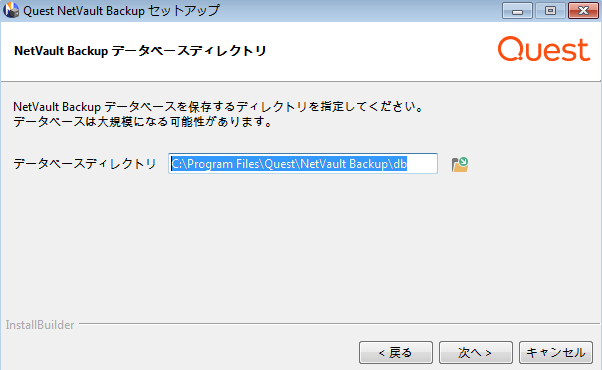 NetVault Backupサーバーをインストールするときには、次に[NetVault Backupデータベース・ディレクトリ]ダイアログ・ボックスが表示されます。このダイアログ・ボックスは、クライアントのインストールの際には表示されません。 |