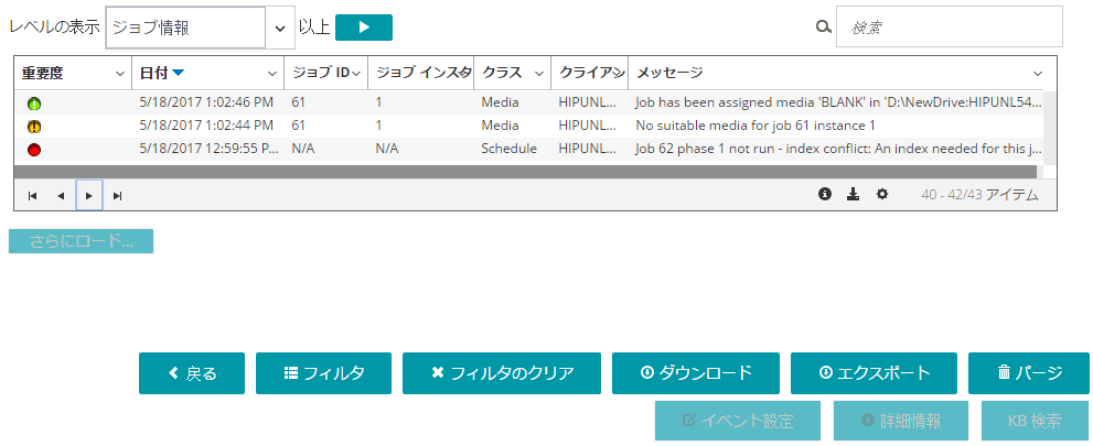 [レベルの表示]オプションを使用して、重要度レベルに基づいてメッセージをフィルタできます。重要度レベルを指定すると、そのレベル以上のメッセージのみが[ログ参照]ページに表示されます。 |