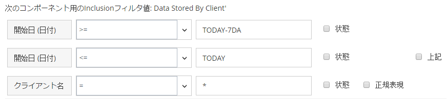 [上と同じ]:[上と同じ]チェック・ボックスは、複数のレポート・コンポーネントに同じフィルタ・フィールドが適用される場合に表示されます。このチェック・ボックスを選択すると、前のフィールドで設定された値と同じ比較値を使用することができます。