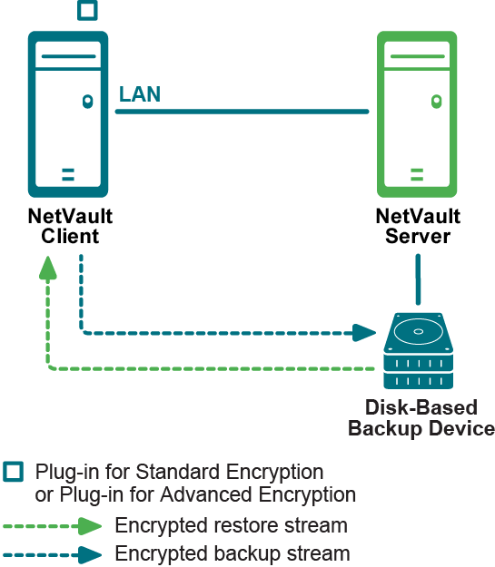 NetVault performs software-based encryption. The backup stream is encrypted using the selected algorithm by the NetVault Server or Client for which the plug-in is enabled. The encrypted data stream is transferred over the network to the backup device where it remains encrypted. During restore, the encrypted backup is transferred from the backup device to the targeted NetVault Client, where the plug-in completes the decryption.