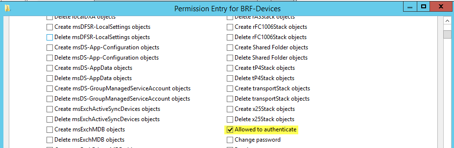 7. Click Select a Principal and find the domain local group you created previously, ensure the type is set to Allow and the Applies to is set to Descendant Computer Objects.  Once the permissions have loaded you want to find and check off the permission Allowed to authenticate. You may have to screen down the list of available permissions to find it. Click Ok, once completed.
