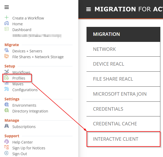 When you select Profiles from the hamburger menu in On Demand Migration for Active Directory, you will see a new section for creating Interactive Client profiles.
