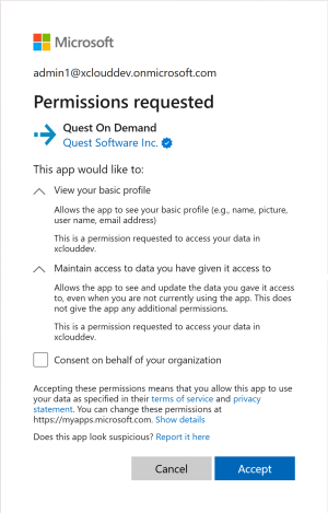As part of the login process with Microsoft Entra ID, users must consent to the set of minimal permissions required by the Quest On Demand application. By default, all users are allowed to consent to applications for permissions that do not require administrator consent. This behavior might be deactivated in some Microsoft Entra ID tenants and may require tenant administrators to enable user consent flow for the Quest On Demand application.