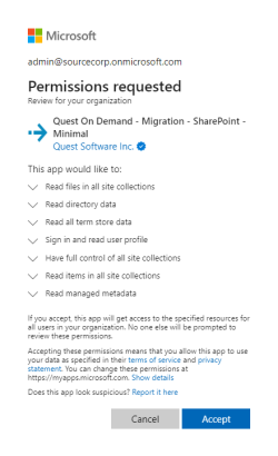 Quest On Demand - Migration - SharePoint - Minimal or Quest On Demand - Migration - SharePoint - Full consent for the source tenant.